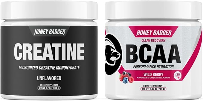 Honey Badger BCAA + EAA Powder | Micronized Creatine Monohydrate | Muscle Growth & Recovery | Natural Recovery for Men & Women | Sugar Free & Paleo | 30 Servings
