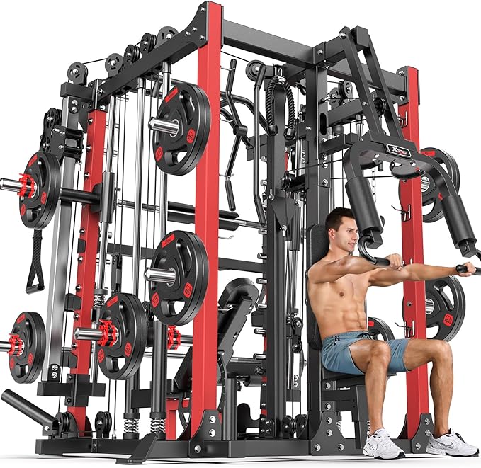 - The L07 smith machine is a powerhouse, combining multiple machines like chest fly, lat pulldown, seated cable row, cable crossover, half rack, squat, and pull-up station. You can do a full body workout at home.They are perfect for all your workout and home gym storage needs!
