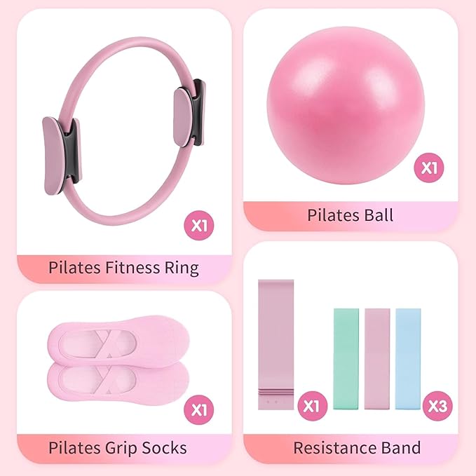 • โœ… Complete Starter Set for Every Need: Our Pilates Kits includes a 14" magic ring, 9" anti-burst mini ball, 1pc long resistance bands, 3 level pilates loop bands,non-slip socks, and a workout guideโ€”perfect for toning your core, thighs, arms, and glutes. Ideal for beginners and pros alike!