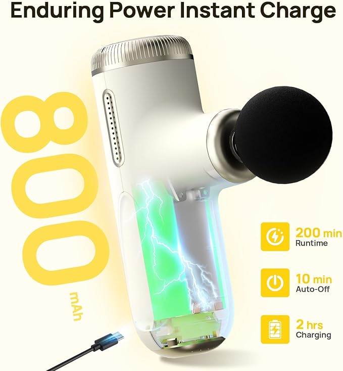 - Whisper-Quiet Technology: Massage gun mini experience undisturbed recovery with our ultra-quiet 55dB operation. The gun massager high-capacity 800mAh battery delivers 200 minutes of continuous therapy, Type-C fast charging fully restores power in just 2 hours. An intelligent 10 minutes auto-shutoff for added safety and battery conservation. Perfect for office, late-night recovery, or focused training environments where peace meets performance.