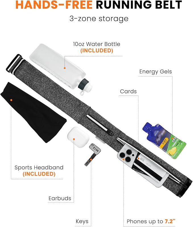 - 【Hydration & Sweat Control Kit】No-bounce fit and secure storage are the basics. What makes this belt different: a 2-in-1 kit with a 10oz curved water bottle for quick mid-run hydration, plus a sweat-wicking headband with ear coverage — blocks sweat in summer, windproof warmth in winter