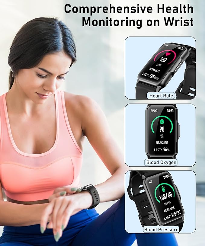 - 【Comprehensive Health Metrics Monitoring】This slim, easy-to-use smart fitness watch packs heart rate, blood oxygen and blood pressure monitoring. You could check those metrics anytime, anywhere from your wrist and check recent data record in APP. You could turn on 24/7 heart rate tracking in the App. To get accurate reading, please wear the watch about 0.78in behind malleolus ulnaris of left hand, and adjust the length of the watch band to make the watch fit snugly with skin to avoid moving.