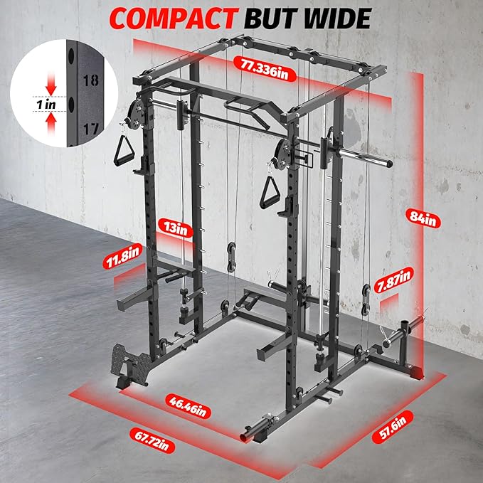 - Comprehensive Workout Solution: Transform your workout routine with a smith machine, squat rack, pulley system, dip bar, and LAT pulldown all in one station. This multifunctional power rack for home gym allows squats, bench presses, rows, and more in a compact footprint, making it a must-have gym machine for home use