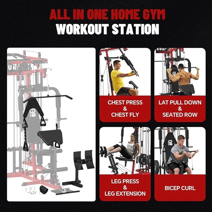 - All in One Home Gym: FAGUS H home gym workout station power cage support all kinds of full body training exercises such as Squat, Chest Press, PEC Fly, Lat Pull Down, Leg Extension, Leg Press, Seated Row, Ab Crunch, Pull Up, Dip Station, Bicep Curl, etc. Just enjoy efficient training and build muscles on your arms, ab, back, hip, legs with a all in one machine in your home gym!