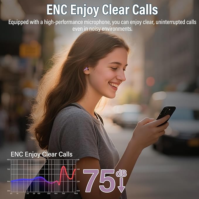 - Clear Calls with ENC Noise Reduction: Bluetooth Headphones Built-in ENC microphones intelligently filter background noise so your voice stays clear and natural during calls. Even in noisy streets, windy weather, or busy gyms, you can enjoy smooth, face-to-face call quality that makes every conversation effortless.