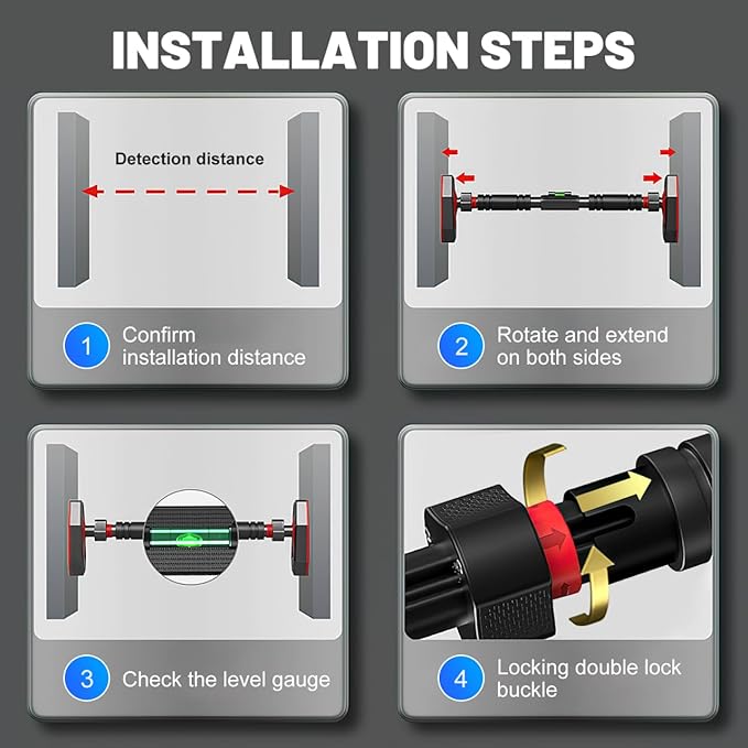 - Easy Installation: Install quickly with detailed instructions, a video guide, and arrow markers on the chin-up bar. Spirit levels on both ends ensure correct setup. Ensure your doorway or wall is solid; avoid ceramic tiles, glass or non-solid doorframe. Note: the marked rotation direction; reversing it may cause locking
