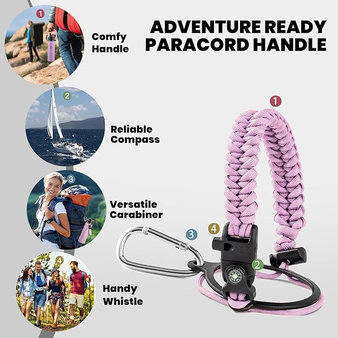 - Iconic Paracord Handle: This insulated water bottle comes with a beautiful hand knit nylon paracord in coordinated color with the water bottle. Configured with a compass and carabiner, this paracord handle is a must-have as a full functional camping / hiking flask