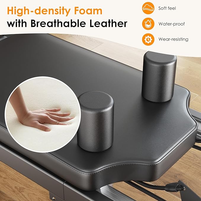 - EASY CARE- Surface material of the pilates equipment is superior UP leather, which is anti-scratch, non-staining and waterproof, and will look brand new after long-term use with just a wipe. In addition,if you meet any problem about the reformer,please contact us first and we will offer solution for you.