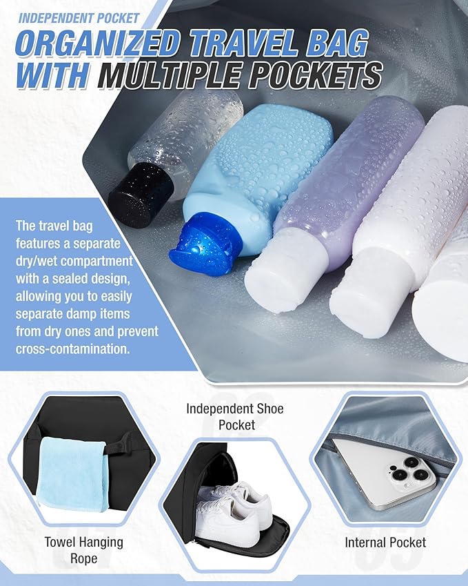 - 💺Designed for Every Journey - This travel duffel bag is designed for efficiency, featuring a separate waterproof compartment for wet gear, a dedicated shoe compartment, side zippered pockets for quick access, and an external towel loop for keeping essentials within easy reach.