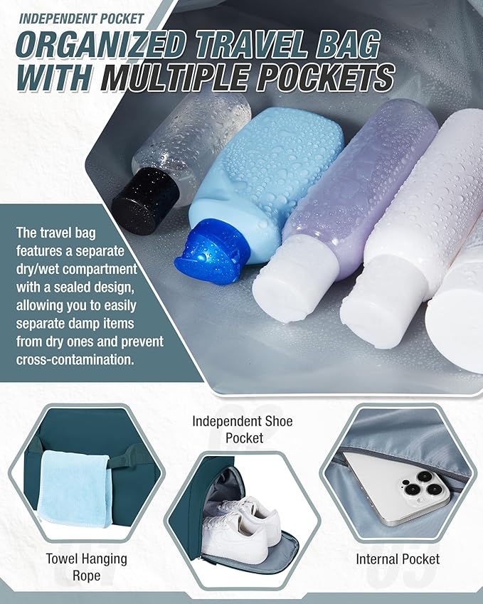 - 💺Designed for Every Journey - This travel duffel bag is designed for efficiency, featuring a separate waterproof compartment for wet gear, a dedicated shoe compartment, side zippered pockets for quick access, and an external towel loop for keeping essentials within easy reach.