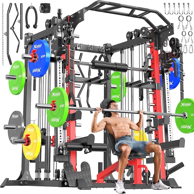 Smith Machine with Cable Crossover System, Multi-Function Squat Rack Power Cage for Home Gym, Power Rack and Packages Weight Sets