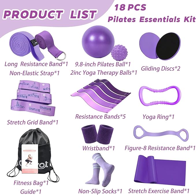 - 【Complete 17PCS Pilates Equipment Set for Home Workouts】 – This pink/purple versatile pilates kit includes 1 mini pilates ball, 5 resistance bands, 1 stretch exercise band, 2 gliding discs, 1 figure-8 resistance trainer, 1 stretching band, 1 multi-level stretching band, 1 long resistance squat band, 1 yoga ring, 1 wrist strap, non-slip socks, 1 fitness bag and 1 workout guide. This pilates essentials kit for women and men suits all fitness levels.