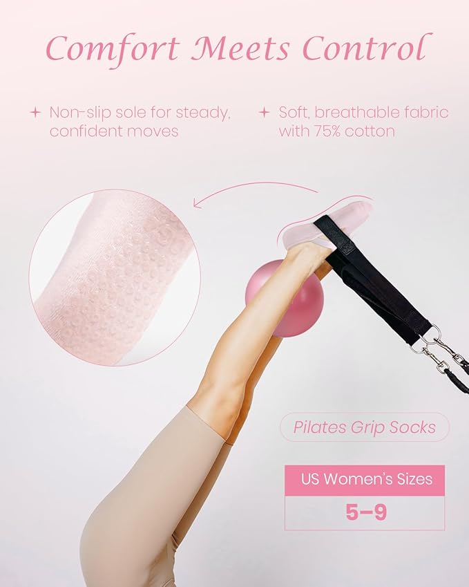 - Mini Ball & Pilates Socks The 9-inch anti-burst Pilates mini ball helps improve balance, alignment, and core stability, while adding challenge to your routines. The included pair of Pilates socks is crafted with 75% cotton for softness and breathability, and features a non-slip sole for secure footing on the mat, reformer, or floor surface. Designed to fit women’s shoe sizes 5–9, these socks ensure confident, stable, and comfortable movement in every session