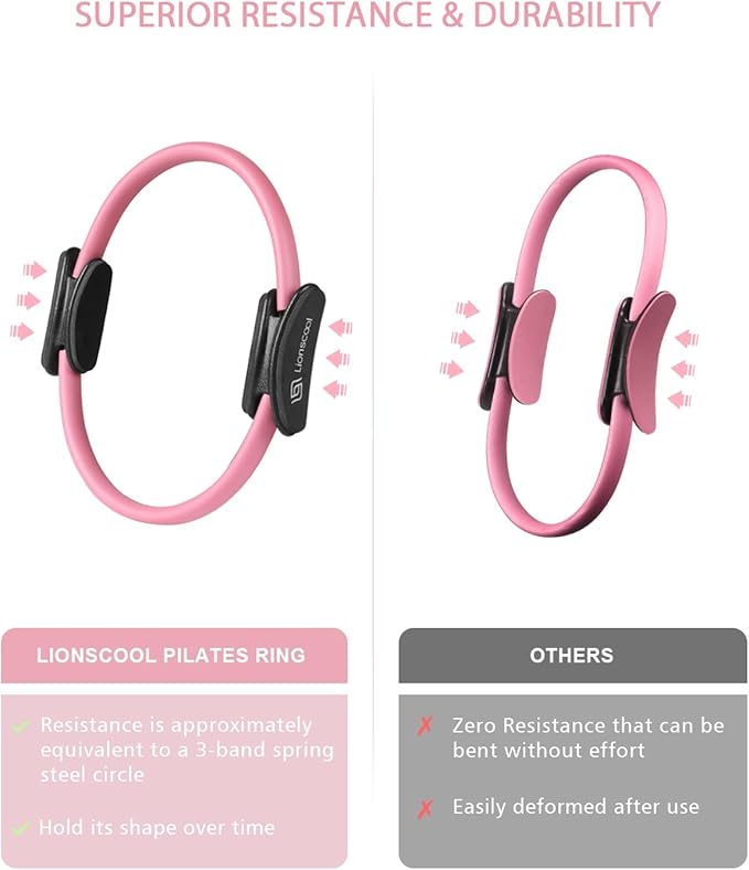 - Durable Design & Balanced Resistance The 14-inch LIONSCOOL Pilates Ring is built for durability, crafted with premium resilient fiberglass encased in a thick rubber shell for exceptional strength and performance. Its resistance is comparable to a 3-band spring steel circle, making it suitable for most users who want effective toning and strength training. The enhanced resistance adds an extra level of challenge, while the 7mm thick dual-sided foam handles deliver unrivaled comfort