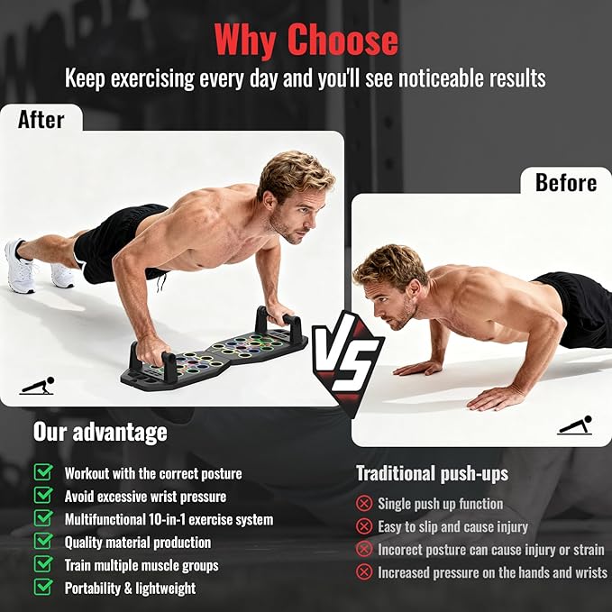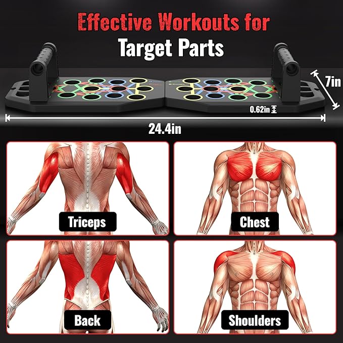 - 【Unique Push Up Board】Color-targeted training for 40% faster results. Maximize chest, triceps, shoulders & back development with smart color zones. Strengthen your core and improve stability on this space-saving and gym-grade platform