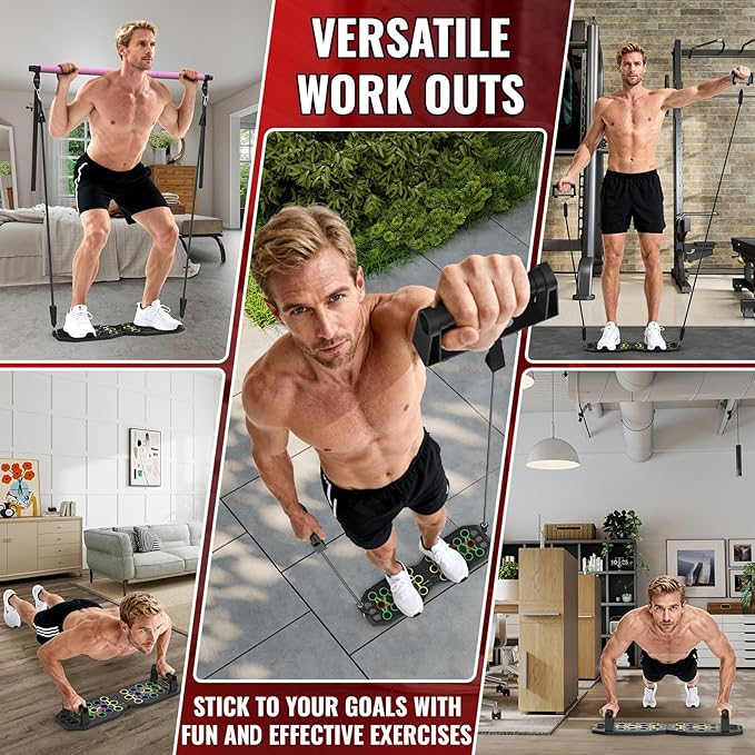 - 【Portable Home Gym System】The portable fitness set includes a foldable push-up board, a 3-section pilates bar, 2 resistance bands, allowing you to get a full-body workout at home without gym equipment
