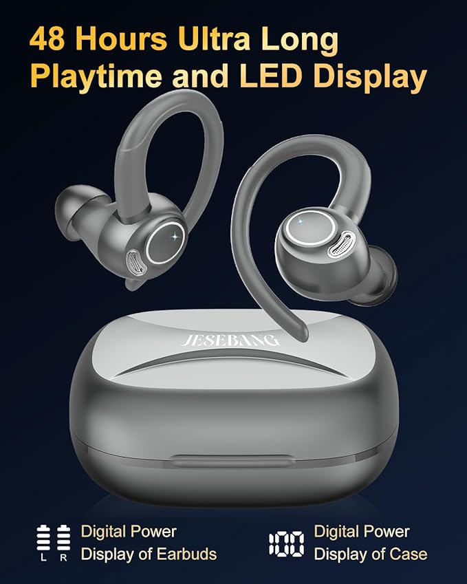 Wireless Earbuds, Bluetooth 5.4 Headphones Sport, Over Ear Buds with ENC Noise Cancelling Mic, 48H, Wireless Earphone with Earhooks, Stereo Deep Bass, IP7 Waterproof Ear Bud for Workout Running, Grey