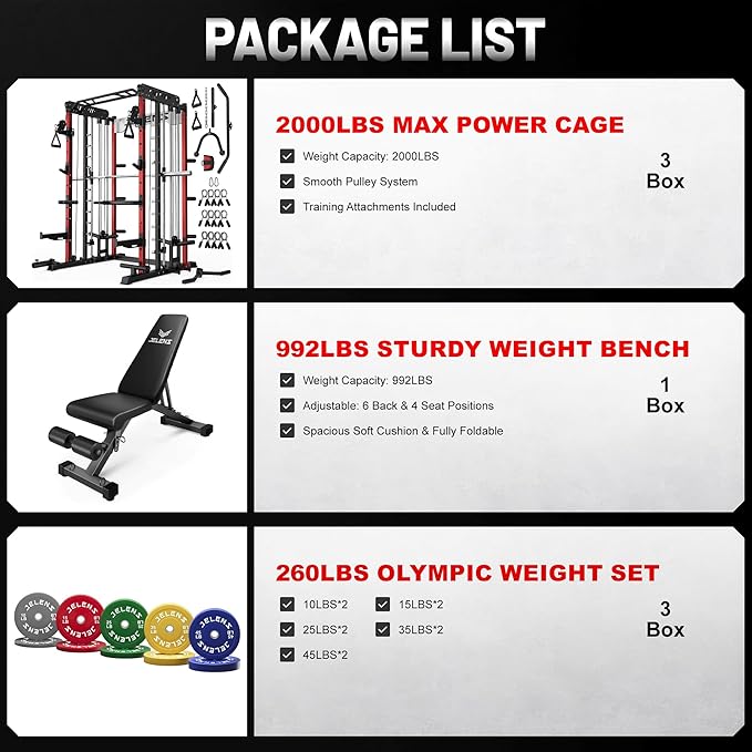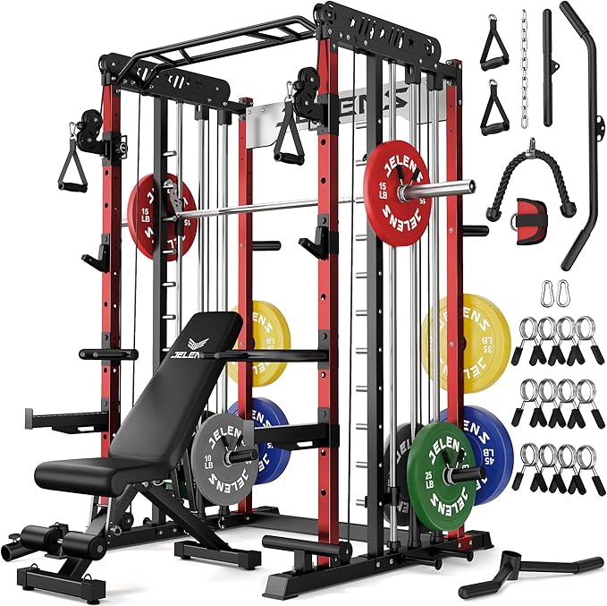 - [Full-Body Workout]: With JELENS Smith machine for home gym, you can exercise your entire body using just one single machine. It's an ideal all in one equipment for squats, pull-ups, bench presses, lat pulldowns, cable flyes, barbell rows, shoulder presses, deadlifts and so on. This fitness machine provides you with a program designed for comprehensive muscle development
