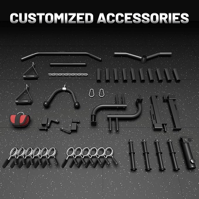 - [Ultimate Versatility & Compatibility]: Compatible with various accessories including lat pull-down bar*1, T-bar*1, pull down bar*1, tricep rope*1, J-hooks*2, cable handle*2, 360° landmine*1 and so on, this workout system precisely accommodates diverse training movements while unlocking expanded workout possibilities. Featuring 11 front and 12 side holes positions, this system universally accommodates market-leading accessories to meet your varying fitness requirements