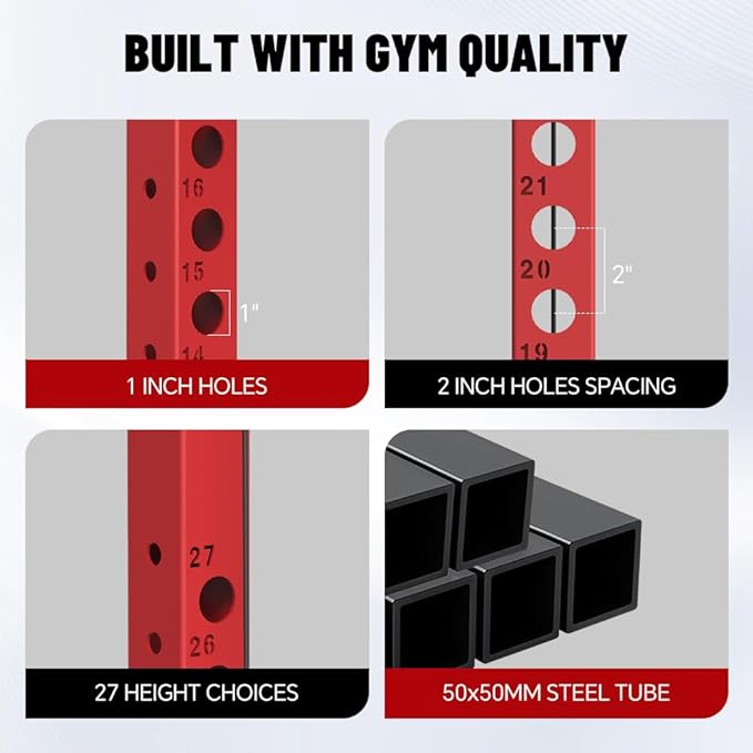 - Multiple Training Accessories: This multifunctional power cage comes with full body training attachments, including 1x tricep rope, 1x ankle strap, 2x cable handles, 1x T-bar, 1x lat pull-down bar, 2x dip bars, 2x J-hooks, 2x safety bars, 2x storage hooks, 1x battle rope ring, 6x weight holders with clamps, 1x 360 degree landmine, 1x cable crossover pulley system and 4x band pegs. No need to buy the extra accessories and you can perform various strength training workouts with just one device.