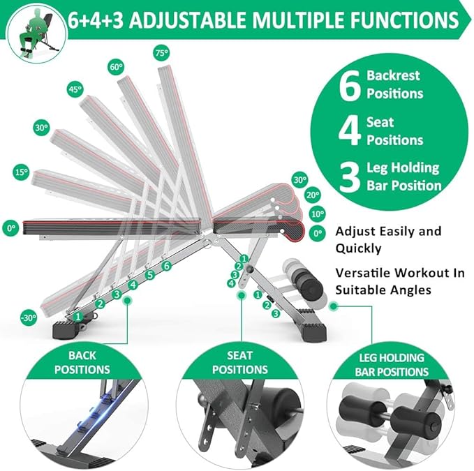- 13 Adjustable Options & Quick Adjustment - This workout bench offers 6 backrest settings, 4 seat adjustments and 3 leg settings. Therefore, this adjustable weight bench is also a tilted, declined or flat bench.