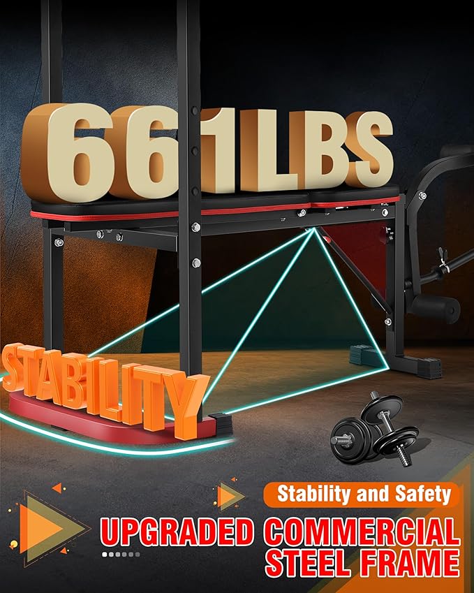 - 【Sturdy and Stable Design】The weight bench features a robust metal frame, ensuring overall structural stability. The U-shaped base design effectively lowers the center of gravity, reducing the risk of tipping. With a weight capacity of up to 660lbs, you can exercise safely. The rubber base at the bottom of the weight bench prevent slipping and protect the floor from scratches and wear.
