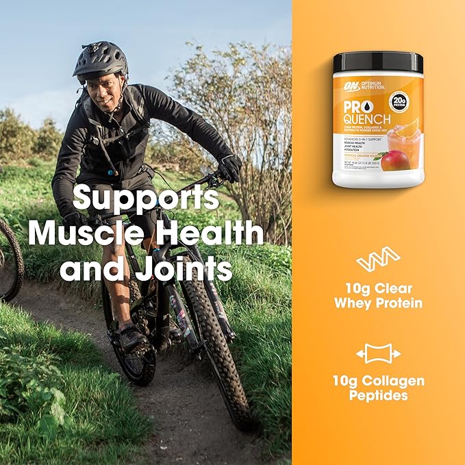 Optimum Nutrition Pro Quench, 10g Clear Protein, 10g Collagen peptides & Electrolyte Powder Drink Mix, Tropical Orange Mango, 20 Servings, 520 Grams (Packaging May Vary)