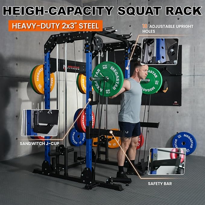 - Space-Efficient Design for Multiple Users: Designed to maximize training efficiency, Features 16 height adjustments, allowing quick setup for squats, bench presses, pull-ups, and cable exercises this power rack allows up to three users to train simultaneously, utilizing the squat rack, cable pulley system, and pull-up bar at the same time—perfect for shared home gyms or partner workouts.