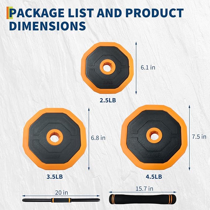 - 44 LBS Package List:Delivered in 1 Box. 2.5 lbs *4,3.5 lbs*4,4.5 lbs*4, Fixed Nut*8,Dumbbell Bar*2, Foam Connector*1,Kettle Rod*1, Push-up Stand*2 66 LB:Delivered in 2 Boxes.Any questions, please feel free to contact us.